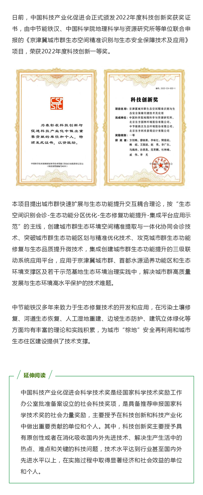 喜報!中節(jié)能鐵漢科研成果獲中國科技產業(yè)化促進會科技創(chuàng)新一等獎