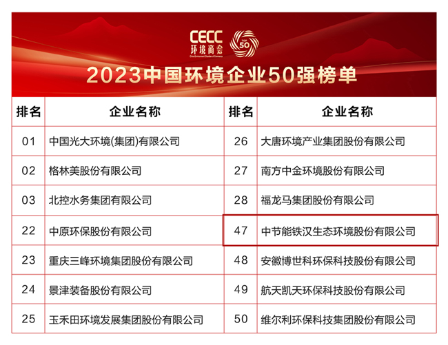 喜報(bào) | 中節(jié)能鐵漢連續(xù)6年榮登“中國(guó)環(huán)境企業(yè)50強(qiáng)”榜單