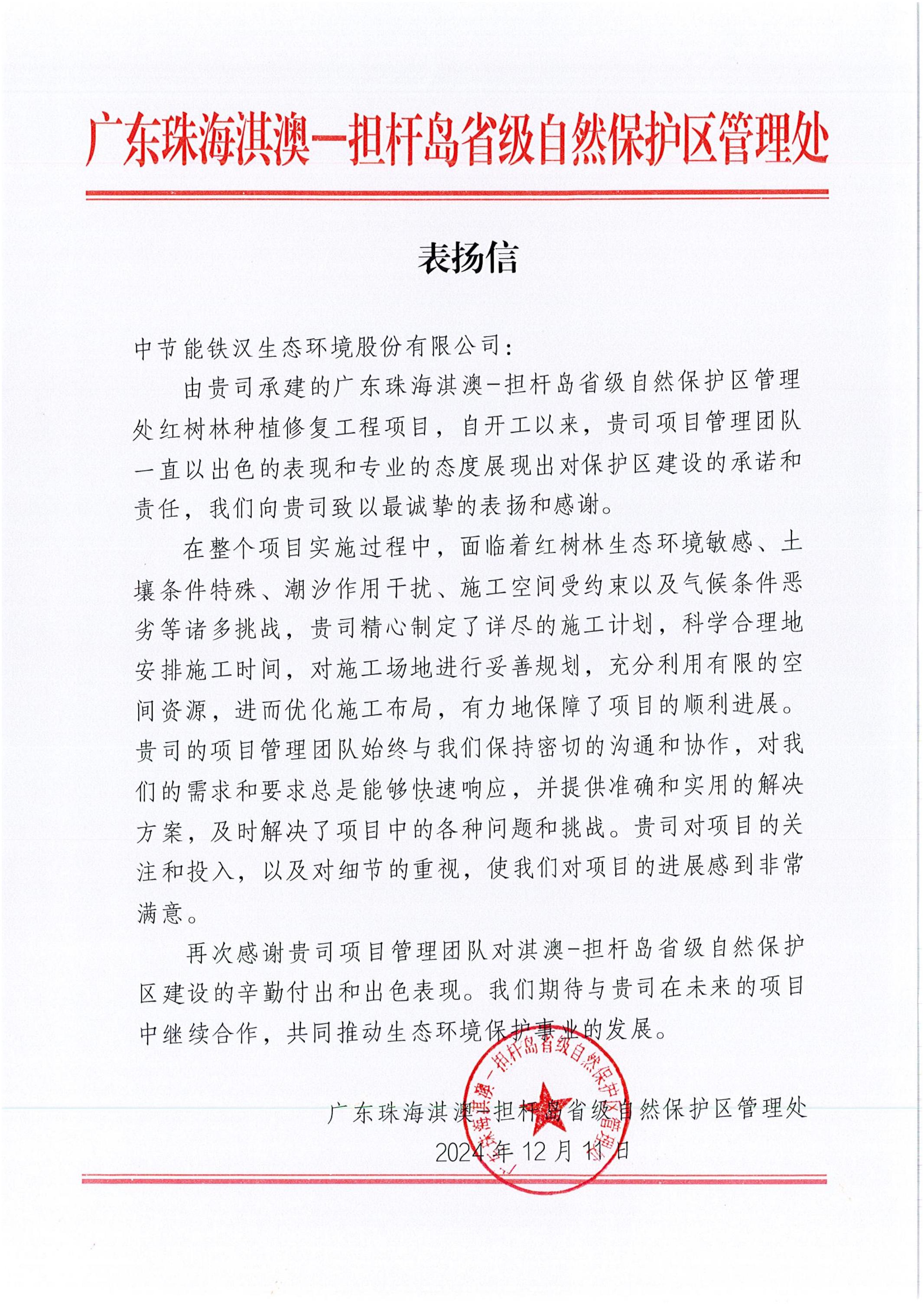 12月11日,由中節(jié)能鐵漢承建的廣東珠海淇澳-擔(dān)桿島省級(jí)自然保護(hù)區(qū)管理處紅樹林種植修復(fù)工程獲得業(yè)主單位來信表揚(yáng)。