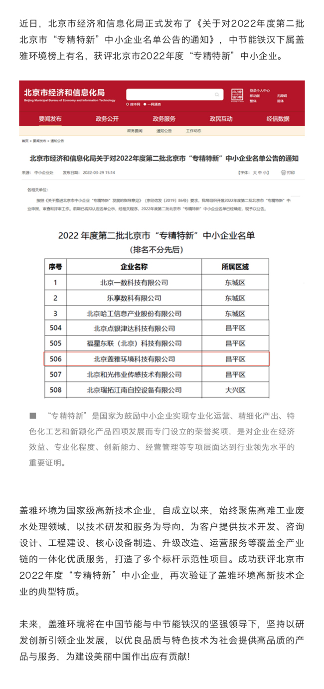 中節(jié)能鐵漢下屬蓋雅環(huán)境獲評北京市2022年度“專精特新”中小企業(yè)