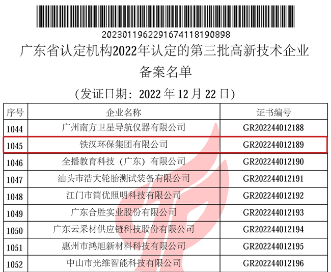 日前,中節(jié)能鐵漢環(huán)保集團(tuán)有限公司(以下簡(jiǎn)稱(chēng)鐵漢環(huán)保)收到全國(guó)高新技術(shù)企業(yè)認(rèn)定管理工作領(lǐng)導(dǎo)小組辦公室發(fā)布的《關(guān)于對(duì)廣東省認(rèn)定機(jī)構(gòu)2022年認(rèn)定的第三批高新技術(shù)企業(yè)進(jìn)行備案的公告》,根據(jù)《廣東省認(rèn)定機(jī)構(gòu)2022年認(rèn)定的第三批高新技術(shù)企業(yè)備案名單》,鐵漢環(huán)保已通過(guò)高新技術(shù)企業(yè)認(rèn)定。這是自2016年起,鐵漢環(huán)保連續(xù)第三次通過(guò)國(guó)家高新技術(shù)企業(yè)認(rèn)定。