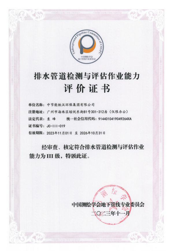 能力提升年 | 鐵漢環(huán)保榮獲排水管道檢測與評估作業(yè)能力評價證書